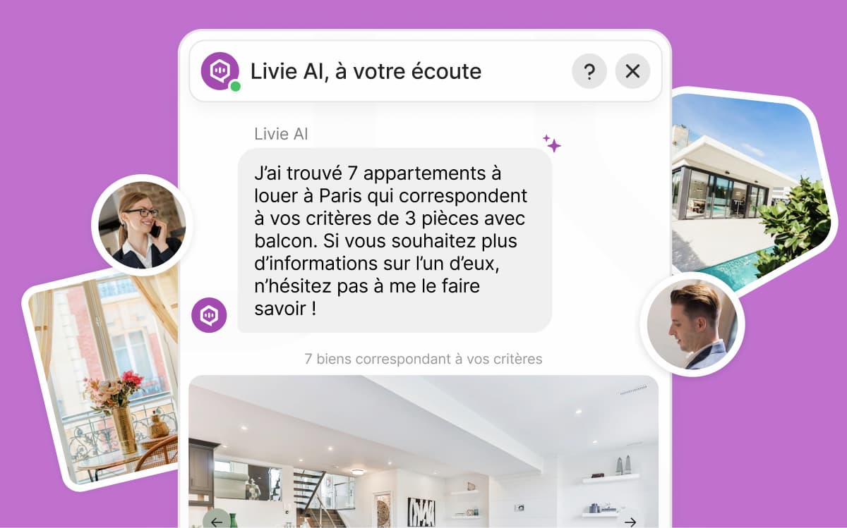 Simplifiez la gestion de vos prospects. Livie guide les visiteurs, répond sur les annonces, planifie des visites et qualifie les demandes.
