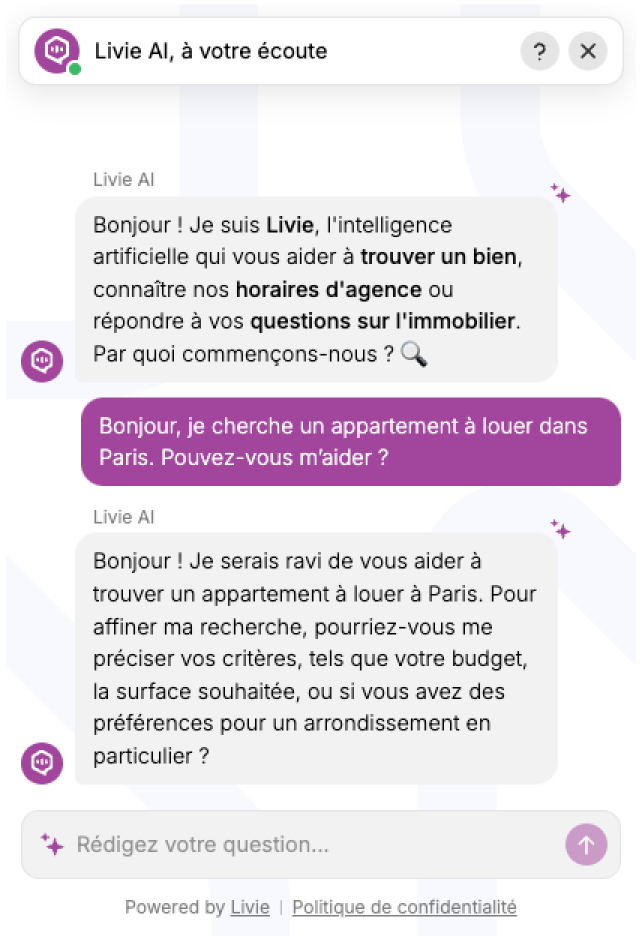 "J’ai trouvé toutes les infos sur le bien que je cherchais, sans attendre qu’on me rappelle. Livie m’a répondu tout de suite, et dans ma langue. C’est simple et rassurant."